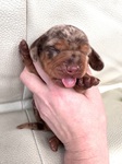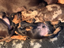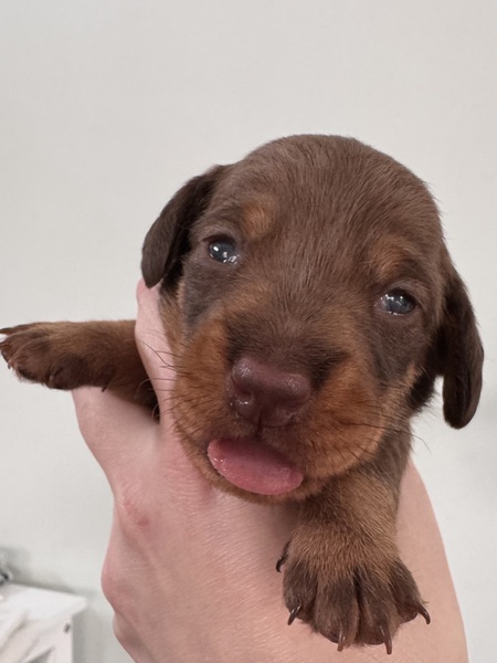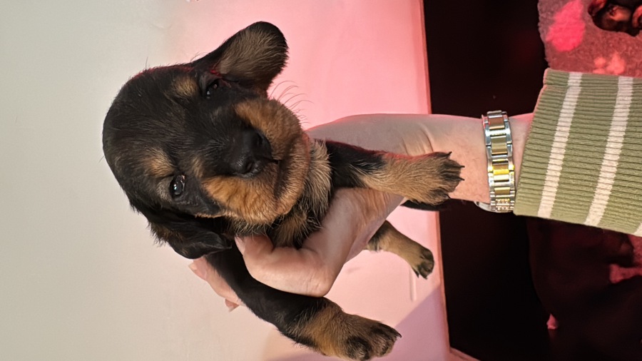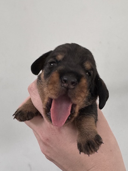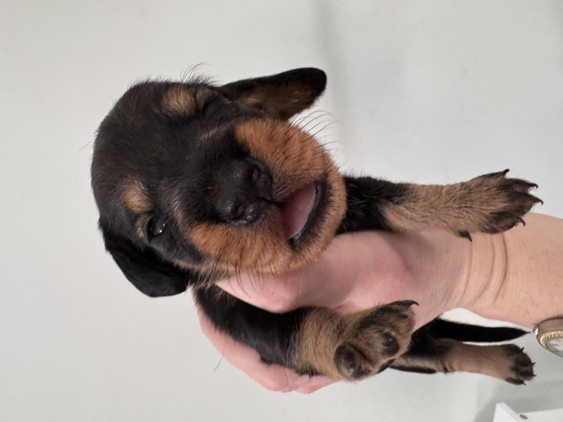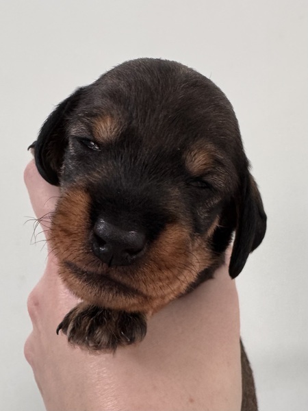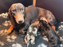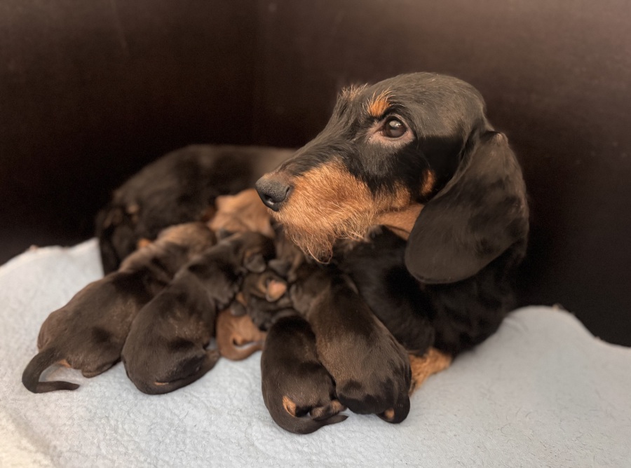 am 03.Februar 2026 hat uns Fine in einer unkomplizierten Geburt fünf wunderbare Welpen in die Wurf Kiste gelegt. Zwei Rüden in dunkelsaufarben und zwei Mädels ebenfalls in dunkelsaufarben und ein braunes Mädchen. Wir sind sehr glücklich über diese wunderbare Verbindung von Jürgen von Heede und unserer Fine. Wir planen eine Hündin für unsere Nachzucht zu behalten und hoffen nun auf eine wunderbare Entwicklung aller Welpen. Besonders hervorzuheben ist, dass alle Welpen aus dieser Verbindung N/CDDY sind , D.h., dass sie genetisch ein geringeres Risiko haben an einer Bandscheibenproblematik zu erkranken. Wir versuchen im Teckelklub in diese Richtung zu züchten, aber durch einen geringen Genpool In Bezug auf das CDDY freie Gen ist es nicht gerade leicht; umso mehr freue ich mich, dass es bei diesen beiden Hunden sehr gut geklappt hat.